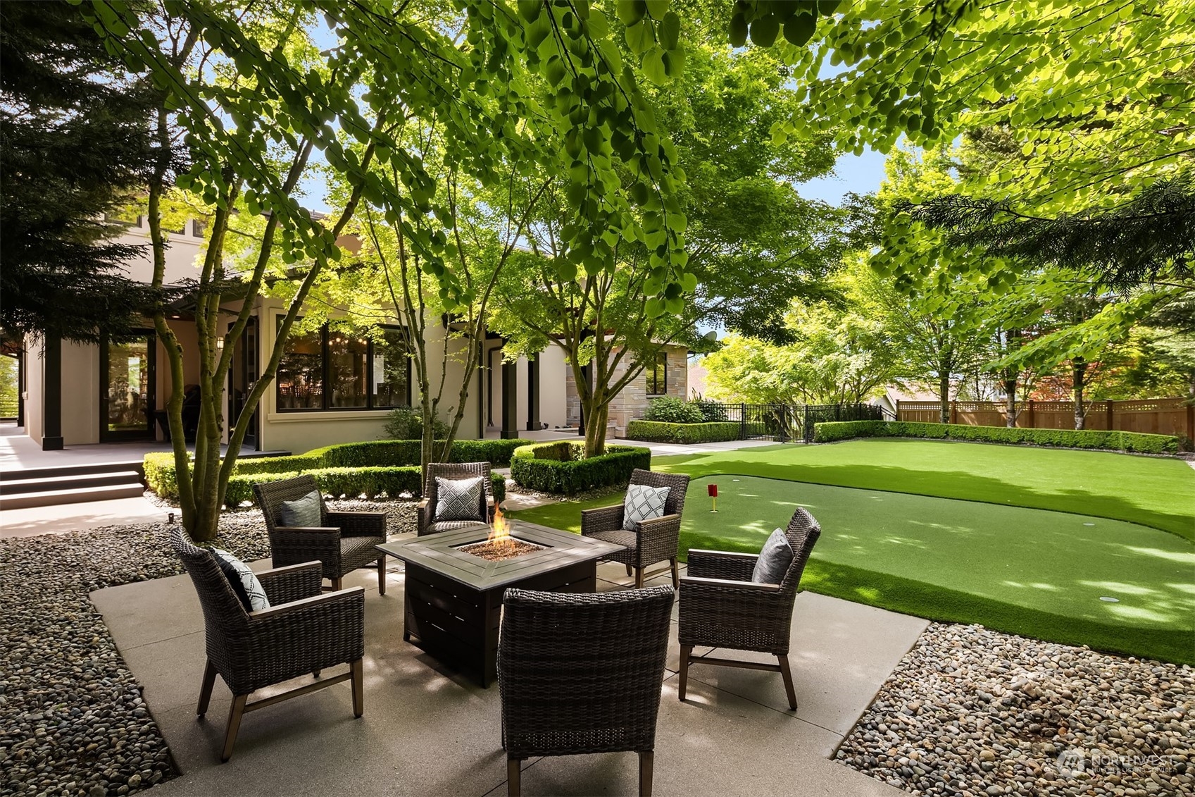 Exceptional NW contemporary home nestled in the gated community of Eagle Nest. This meticulously maintained residence, spanning 6040 sf, offers luxury living at its finest. Designed by Jeff Loveless, the home boasts dramatic floor-to-ceiling windows framing breathtaking Cascade Mountain views and dreamy sunsets, creating a seamless indoor-outdoor connection. Built for today's lifestyle, find an expansive chef's kitchen with an inviting great room, main floor secondary primary suite, office, media room, sauna, home gym, dog washing station, putt putt green & more! This home is an entertainer's dream. Enjoy lush private outdoor spaces and tranquil surroundings. Comfort, convenience & elegance. Don't miss the opportunity to call this your own.